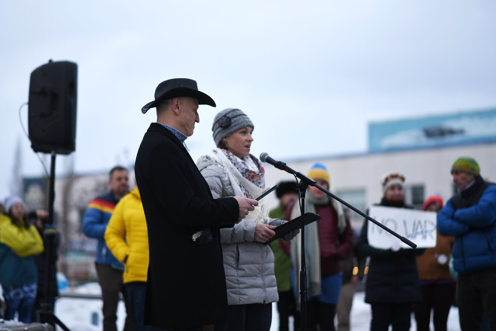 A diverse group of people gathers outdoors in Anchorage during winter, with two individuals speaking at a microphone, demonstrating solidarity at a 'Stand with Ukraine' rally.