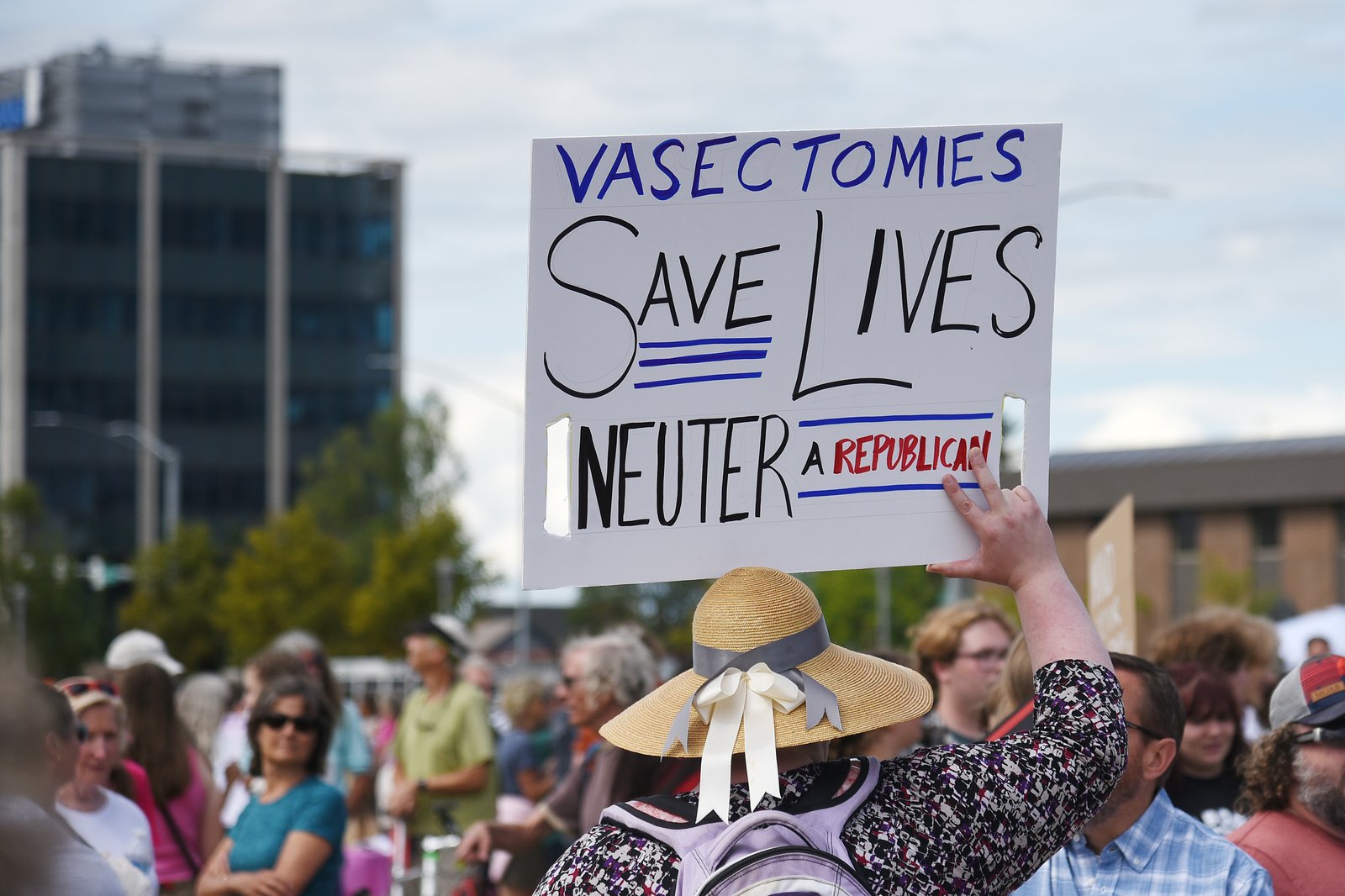 A person holds a protest sign reading 'VASECTOMIES SAVE LIVES NEUTER A REPUBLICAN' at a Planned Parenthood rally in downtown Anchorage, Alaska, with a crowd and city buildings in the background.