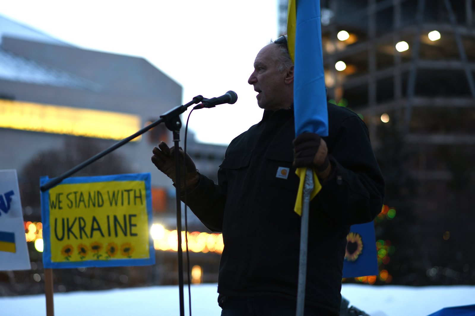 A man speaks into a microphone at an outdoor rally in Anchorage, holding a Ukrainian flag. A sign nearby reads 'WE STAND WITH UKRAINE' with sunflowers, and snow covers the ground, indicating a winter event.