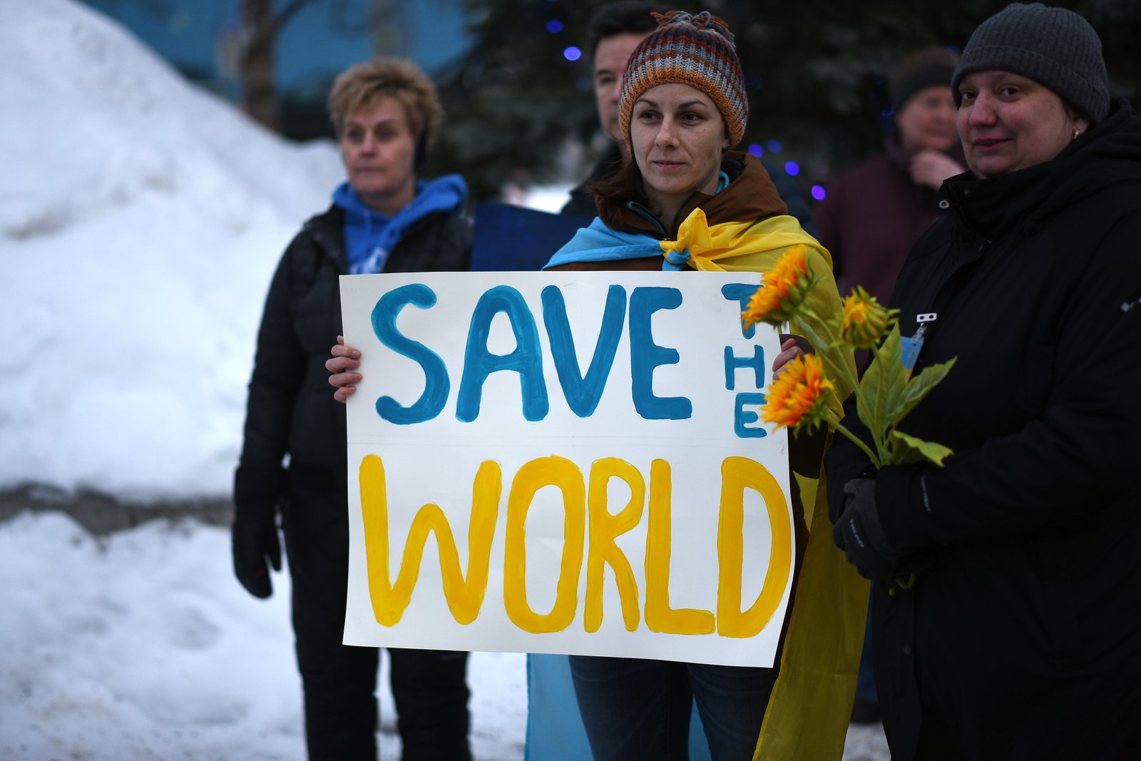 A group of people, including a woman holding a 'SAVE THE WORLD' sign in blue and yellow, gather in a snowy outdoor setting to show solidarity with Ukraine. Another woman holds yellow and orange flowers.