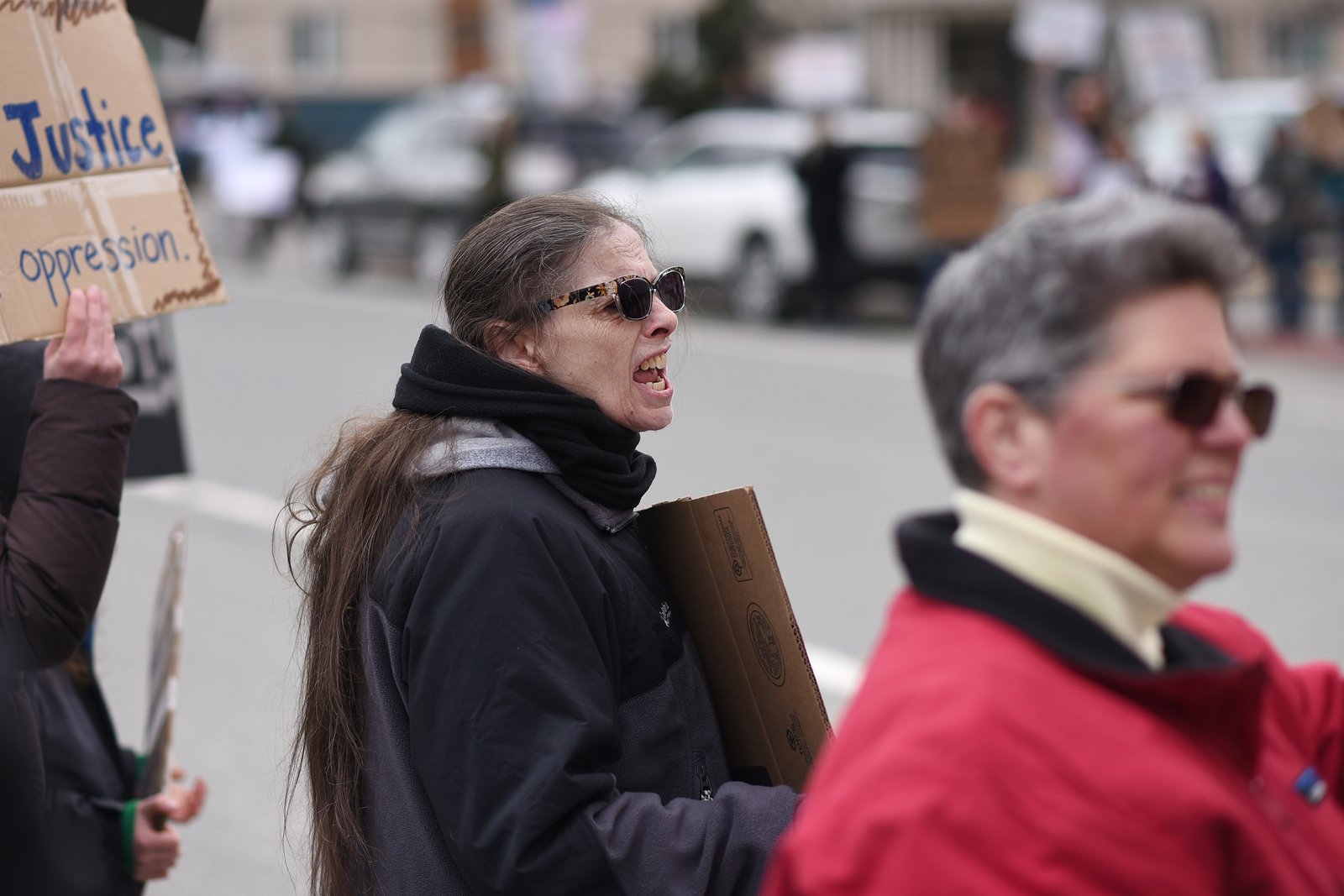 A woman with long brown hair and sunglasses shouts during a protest in Anchorage, holding a cardboard box. Another person in a red jacket and sunglasses is partially visible in the foreground, while a protest sign reading 'Justice' and 'oppression.' is visible on the left.