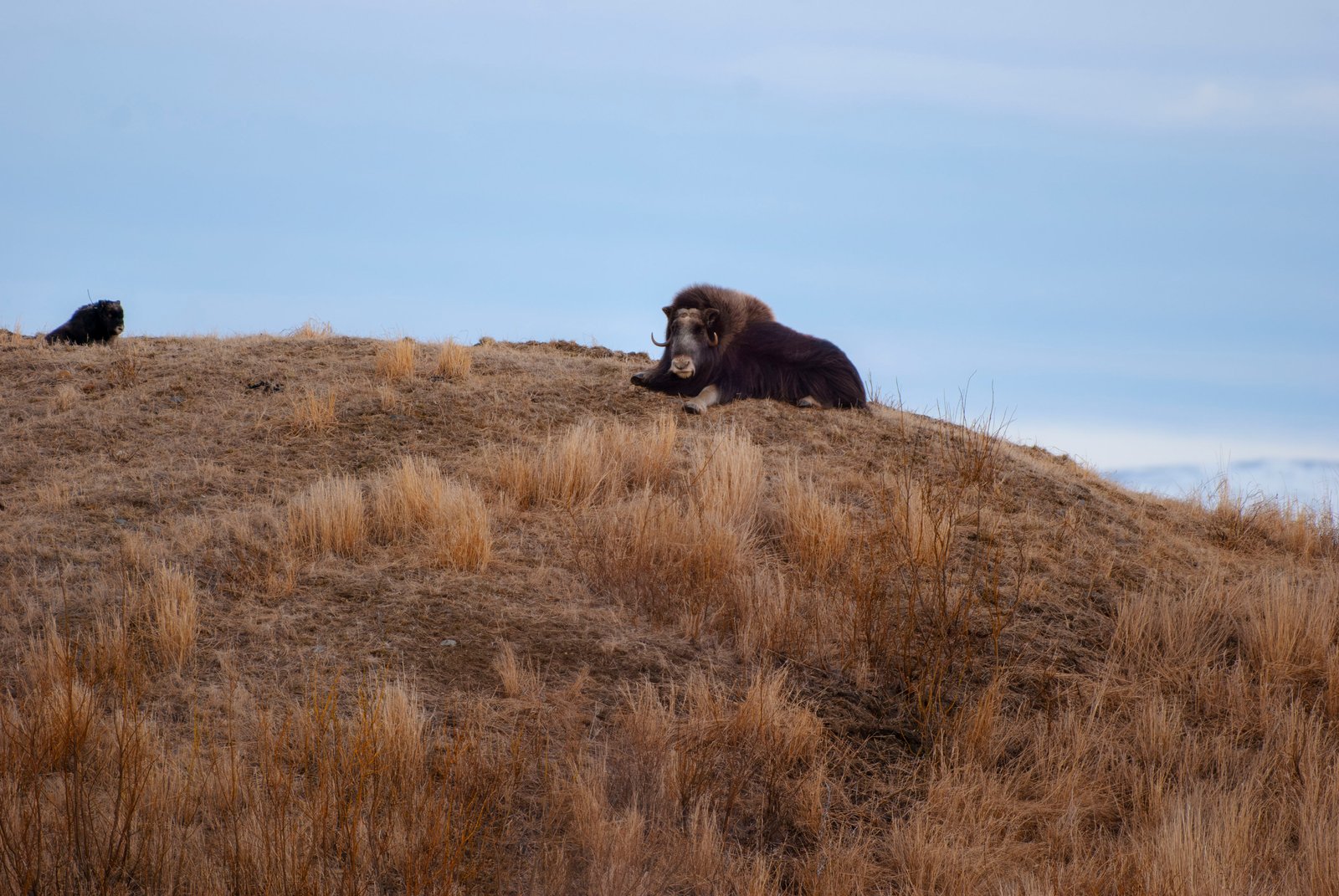 Two muskoxen are visible on a dry, brown grassy hillside under a light blue sky. One muskox lies prominently in the foreground, looking towards the viewer, while another is partially visible further up the hill on the left.