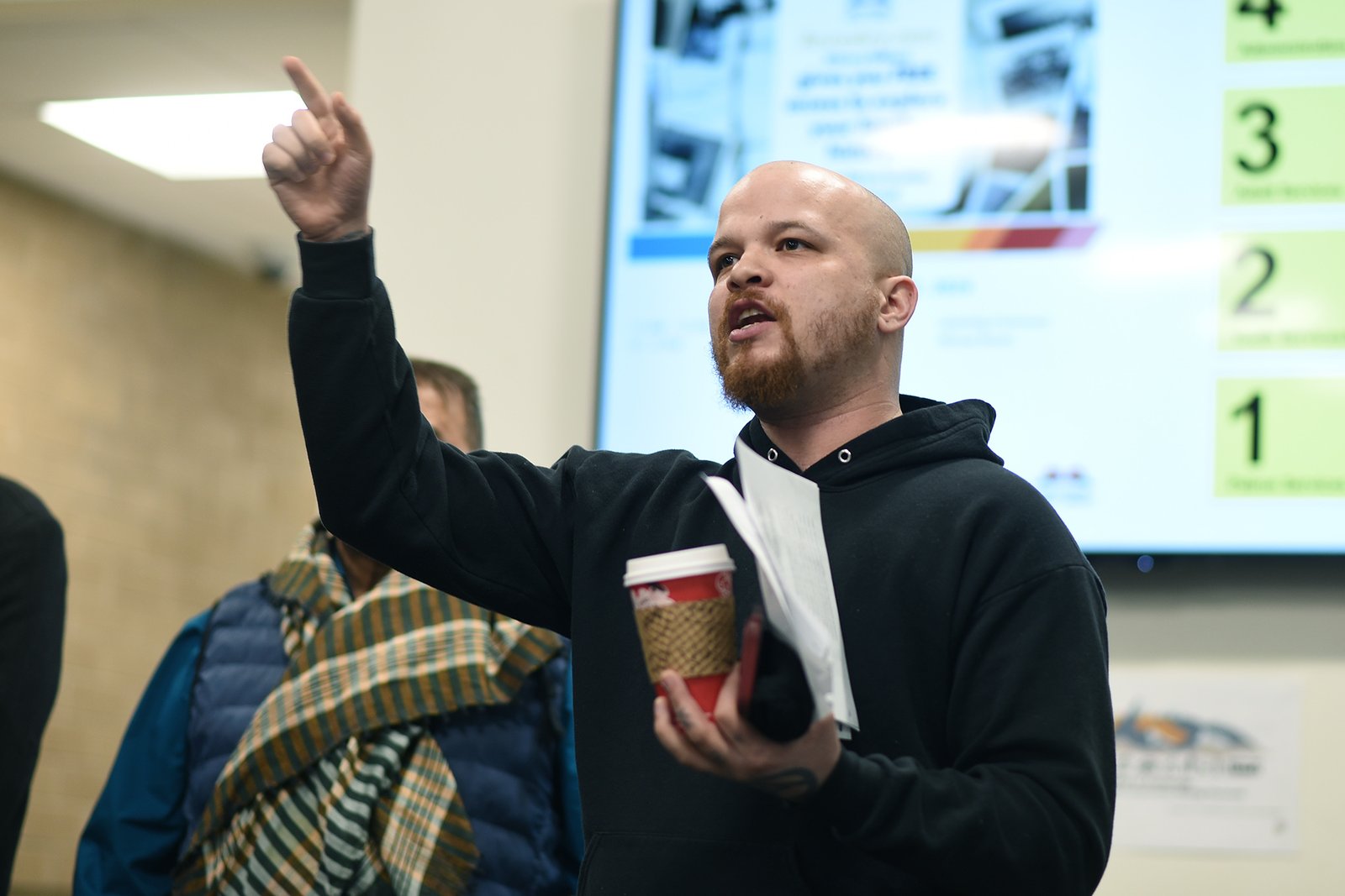 Michael Patterson, a bald man with a beard, wearing a black hoodie, speaks passionately while gesturing with his right hand and holding a coffee cup and papers in his left. He is addressing supporters indoors, with a large screen displaying numbers and images in the background, likely near the Anchorage Assembly chambers.