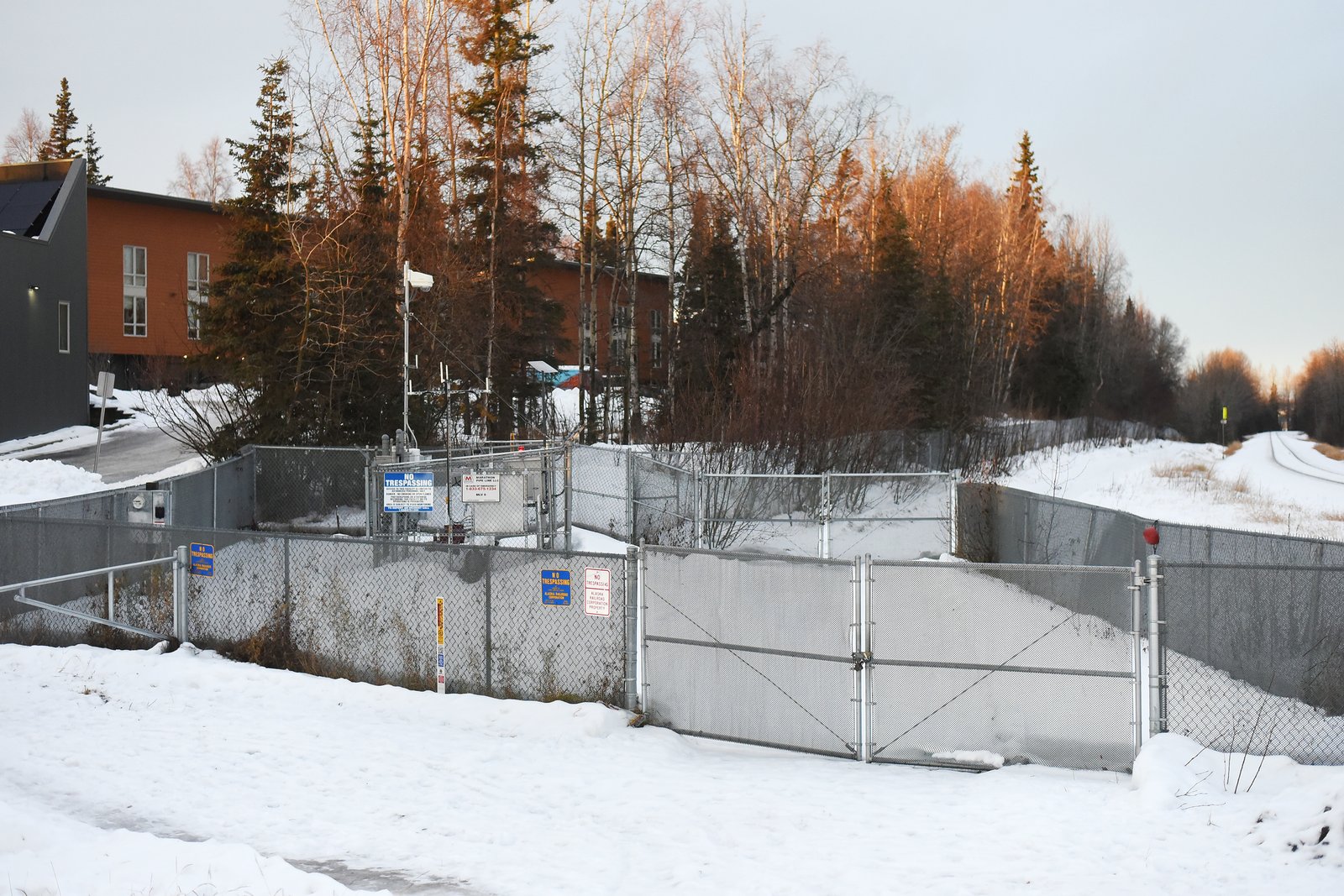 A fenced industrial site belonging to Marathon Petroleum Corp is covered in snow during winter in Turnagain, Alaska. Bare trees and buildings are visible in the background, with railroad tracks extending into the distance on the right.