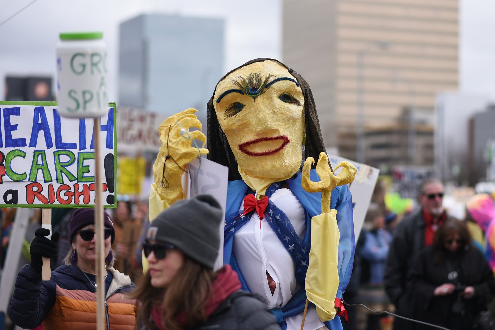 A person in a large, elaborate, yellow mask and blue costume holds a trident at a protest in Anchorage, with signs advocating for healthcare rights visible in the background.
