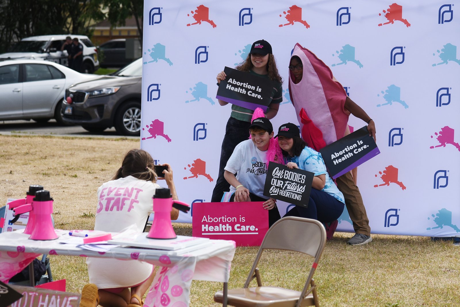 A group of young people, including one in a uterus costume, gather at a Planned Parenthood rally in downtown Anchorage, Alaska. They hold signs reading 'Abortion is Health Care' and 'Our Bodies Our Futures Our Abortions' in front of a branded banner.