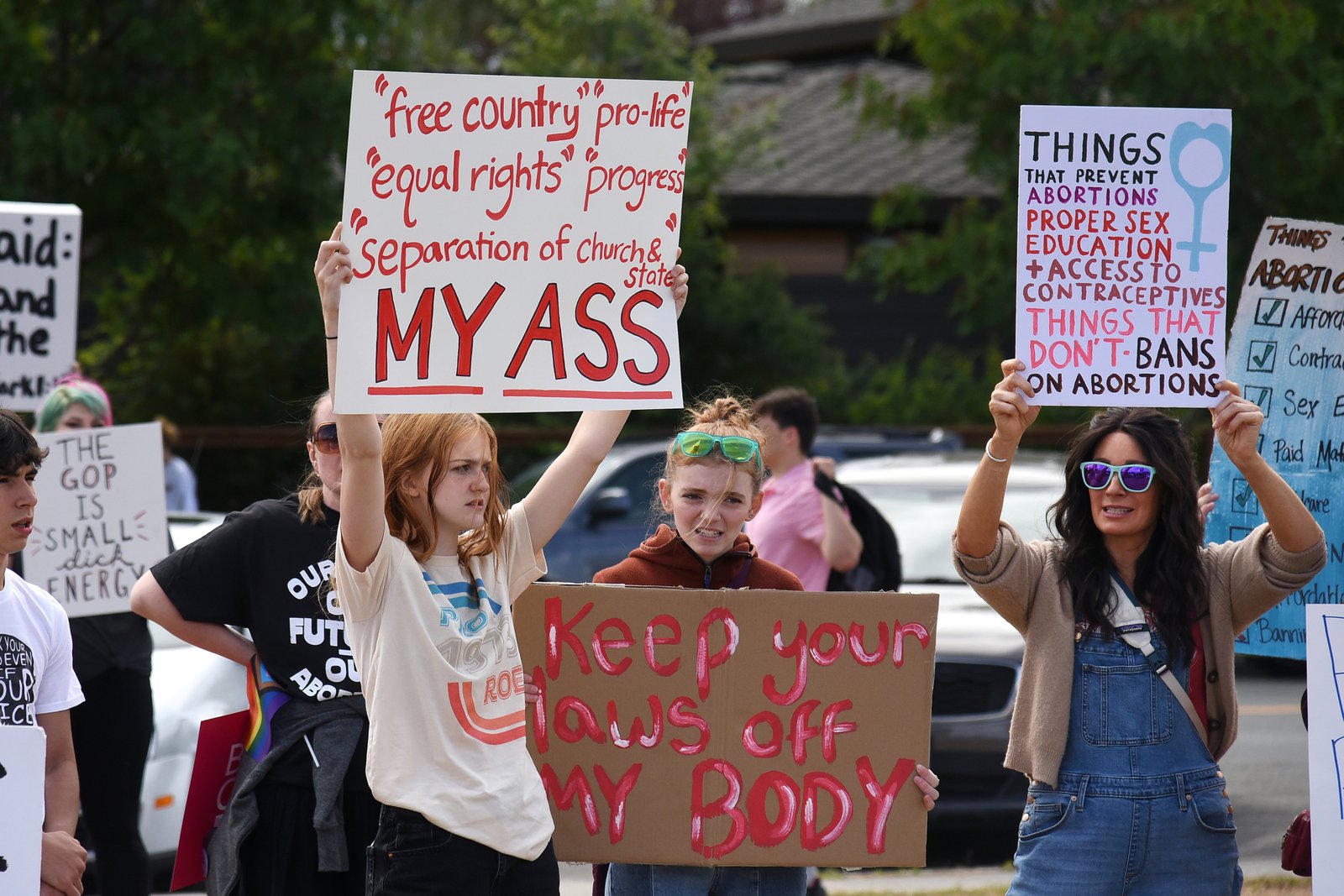A group of individuals, primarily young adults, participate in a Planned Parenthood rally in downtown Anchorage, holding signs advocating for reproductive rights and criticizing political stances on abortion.
