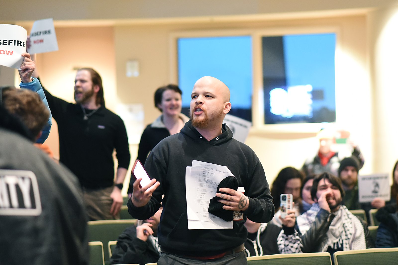 Michael Patterson, a man with a bald head and beard, speaks passionately while holding papers and a phone, leading a disruption at an Anchorage Assembly meeting. Other attendees are visible in the background, with one person holding a sign that reads 'CEASEFIRE NOW'.