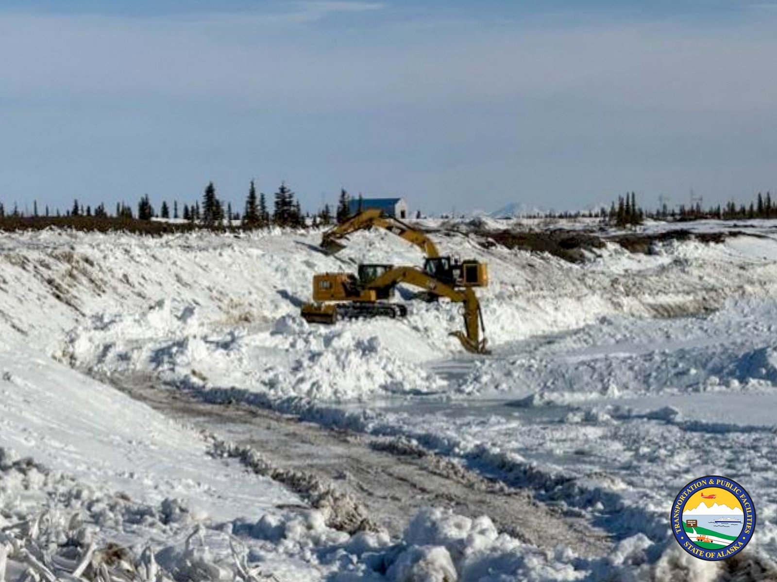 Two yellow excavators are actively digging in a snow-covered trench in Noatak, Alaska, surrounded by large piles of snow. In the background, evergreen trees and a small blue building are visible under a clear sky.