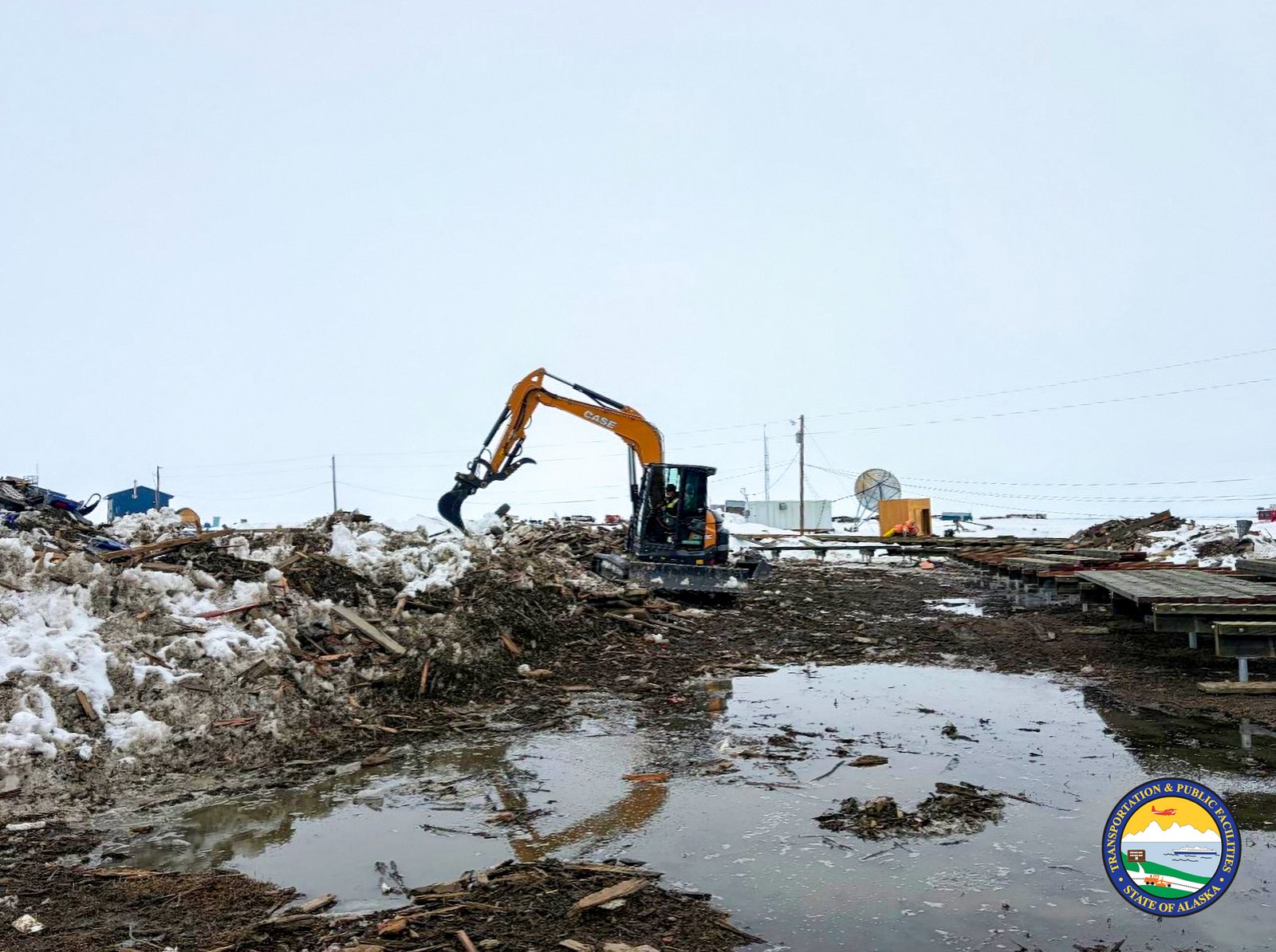 An orange CASE excavator with a grapple attachment clears a large pile of snow, mud, and debris in a muddy, rural landscape. Puddles are visible on the ground, and distant buildings, utility poles, and a satellite dish are under a cloudy sky.