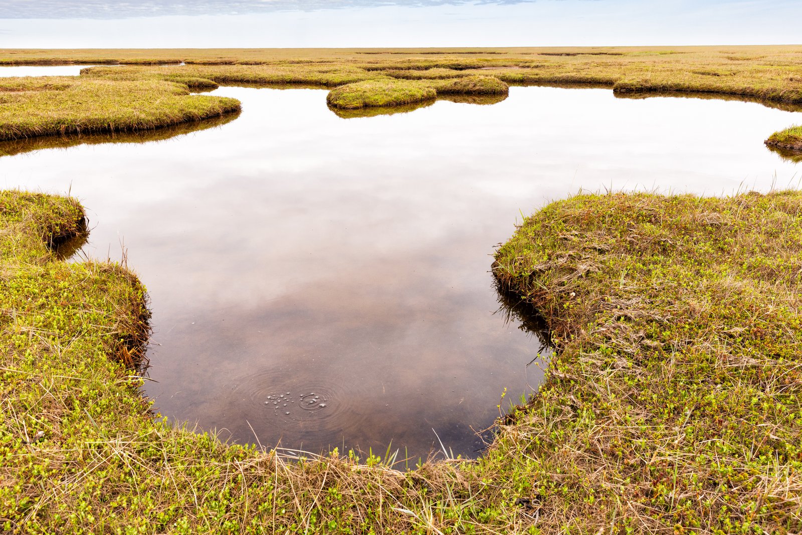 An expansive view of a flat tundra landscape featuring numerous small, irregularly shaped ponds reflecting the overcast sky. In the foreground, ripples and small bubbles are visible on the surface of one pond, indicating methane release.