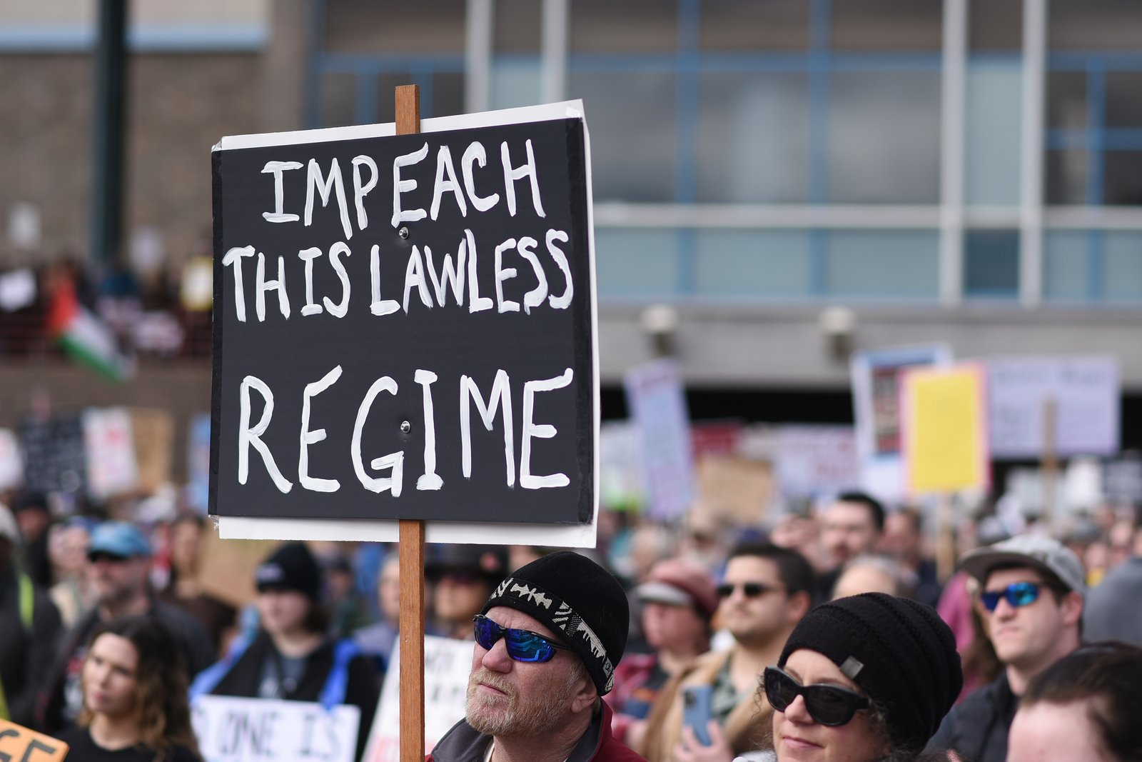A protestor holds a black sign with white text reading 'IMPEACH THIS LAWLESS REGIME' at a demonstration in Anchorage. A crowd of people in winter hats and jackets fills the background, with blurred urban buildings behind them.
