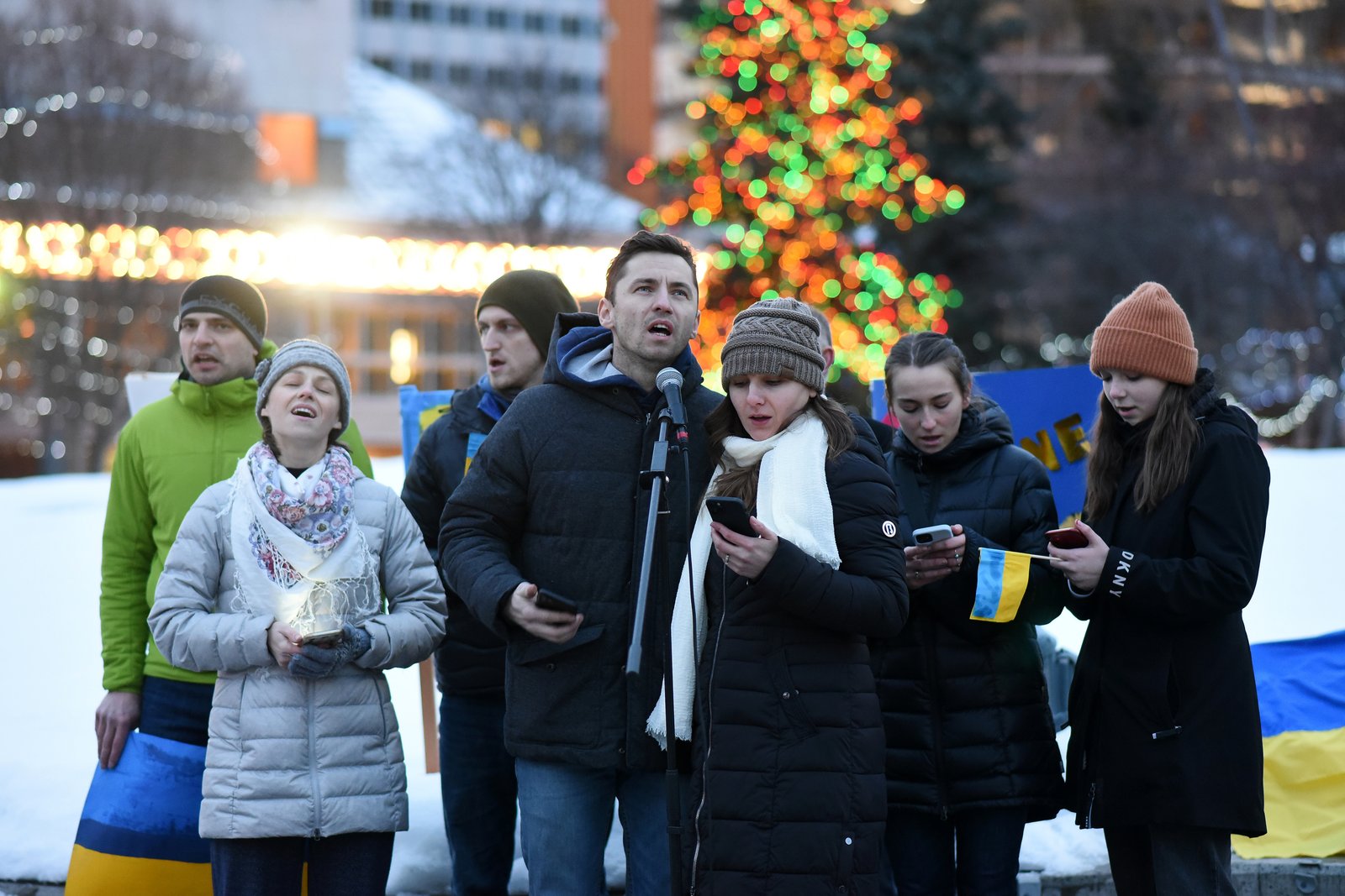 A group of people, dressed in winter clothing, gather outdoors in Anchorage, some singing into a microphone, others holding phones and a Ukrainian flag, with a brightly lit Christmas tree in the background.