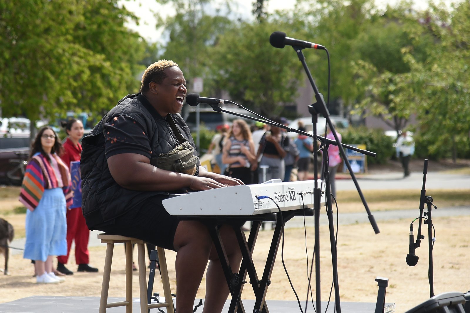 A person with short, light-colored hair sings into a microphone while playing a white Roland keyboard outdoors. They are wearing a black t-shirt, a black quilted vest, and a fanny pack. In the background, other people are visible, and trees line the area, indicating a community event in downtown Anchorage.