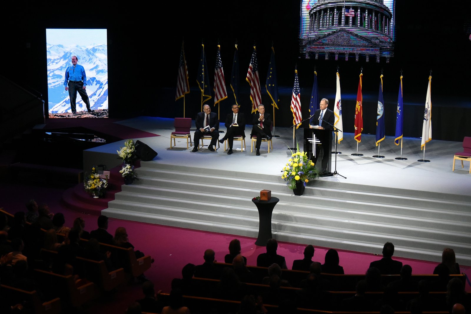 An indoor memorial service honoring Don Young, featuring a speaker at a podium, seated dignitaries, and a large screen displaying a photo of Young in a snowy mountain landscape. U.S. and Alaska state flags are displayed on the stage, with an audience visible in the foreground.