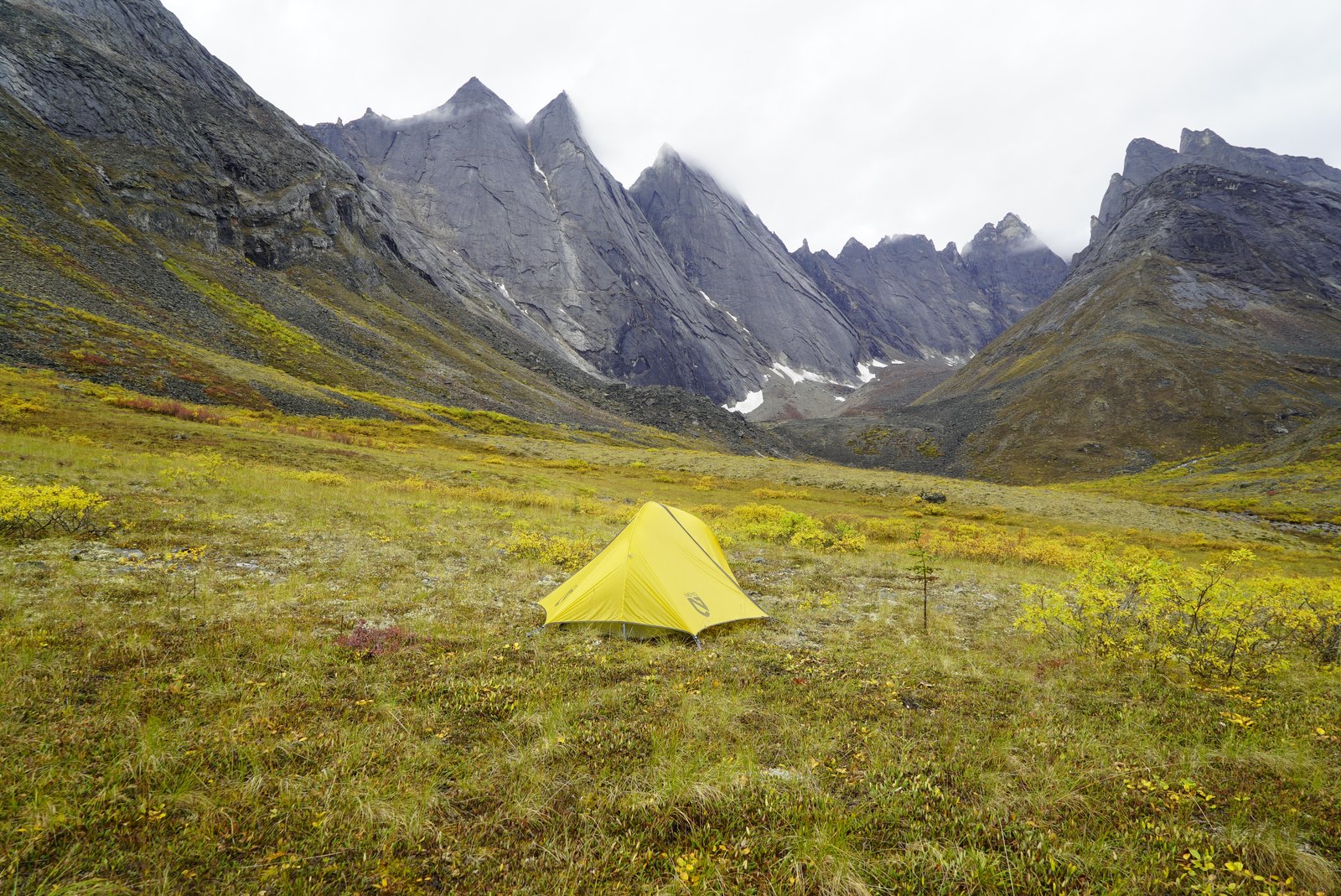 A bright yellow tent is pitched on a vibrant green and yellow valley floor, surrounded by towering, jagged grey mountains under an overcast sky. Patches of snow are visible on the mountain slopes, and the vegetation shows distinct fall colors.
