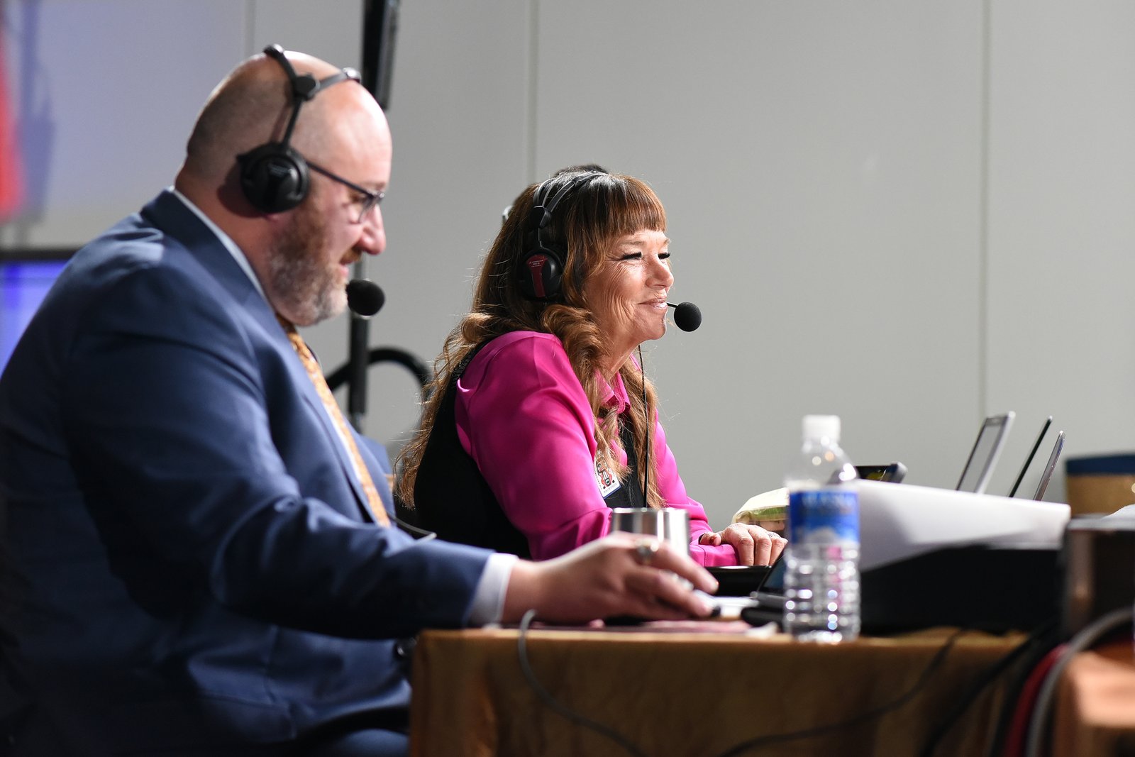 Two broadcasters, a man and a woman, wear headsets with microphones while sitting at a table, smiling during what appears to be live election coverage. The man on the left wears a blue suit, and the woman on the right wears a pink shirt.