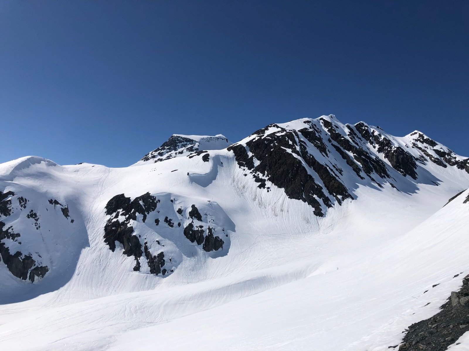 A vast landscape of snow-covered mountains under a clear blue sky, revealing dark rock faces and visible ski tracks on the pristine slopes.