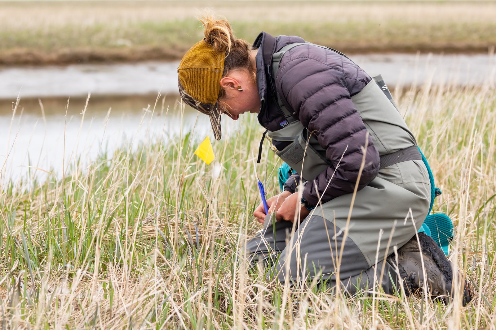 A field biologist kneels in tall grass next to a body of water, observing a nest marked by a yellow flag. Dressed in waders and a puffer jacket, they appear to be taking notes during environmental fieldwork.