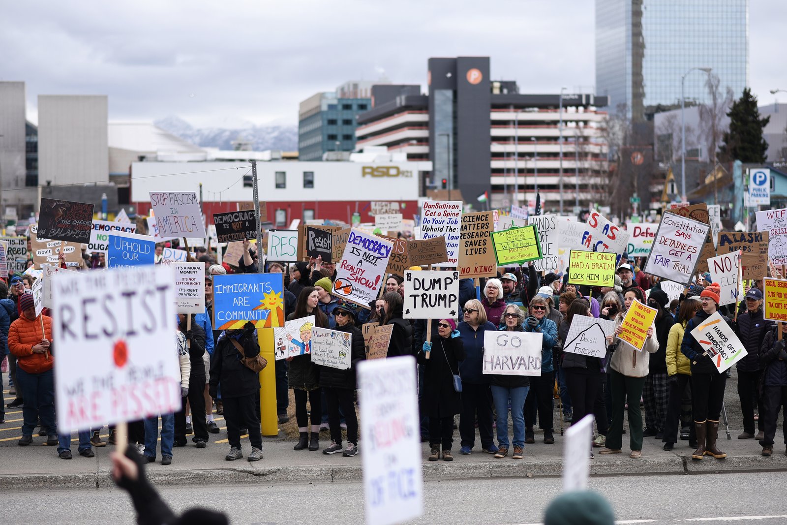 A large crowd of people gathers on a city street in Anchorage, Alaska, holding various protest signs. Distant snow-capped mountains and urban buildings are visible under an overcast sky.