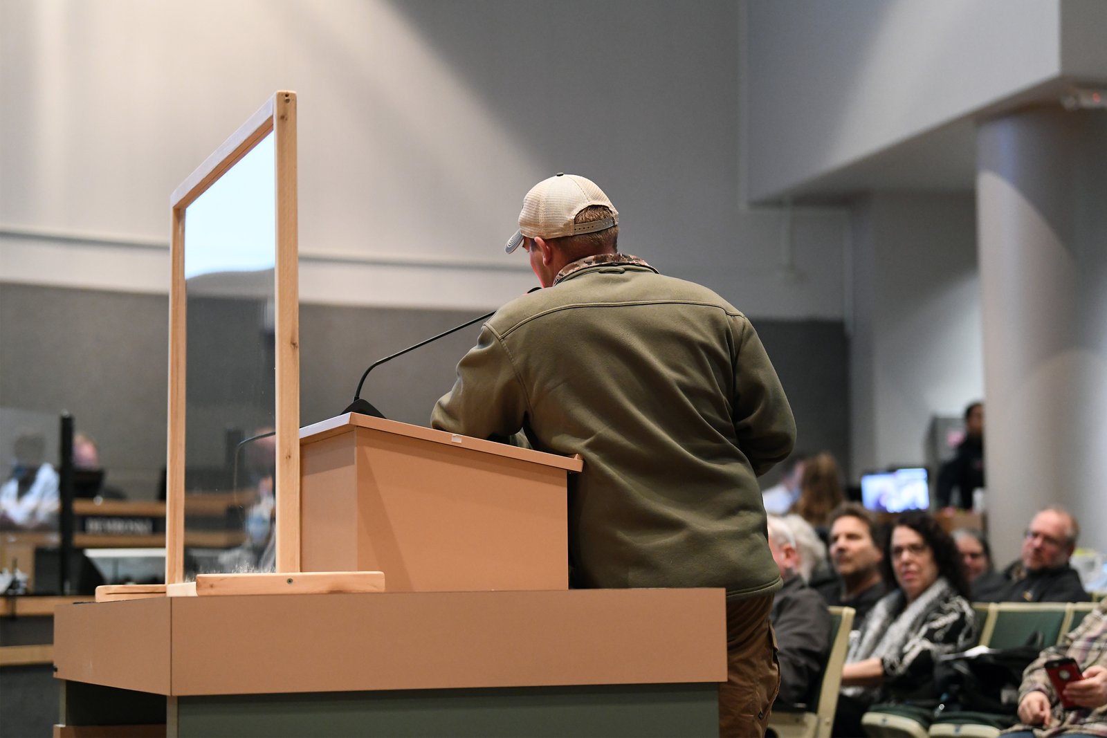 A person wearing a cap and a green jacket speaks at a podium with a clear barrier, addressing an Anchorage Assembly meeting. Several audience members are visible in the background, listening intently.
