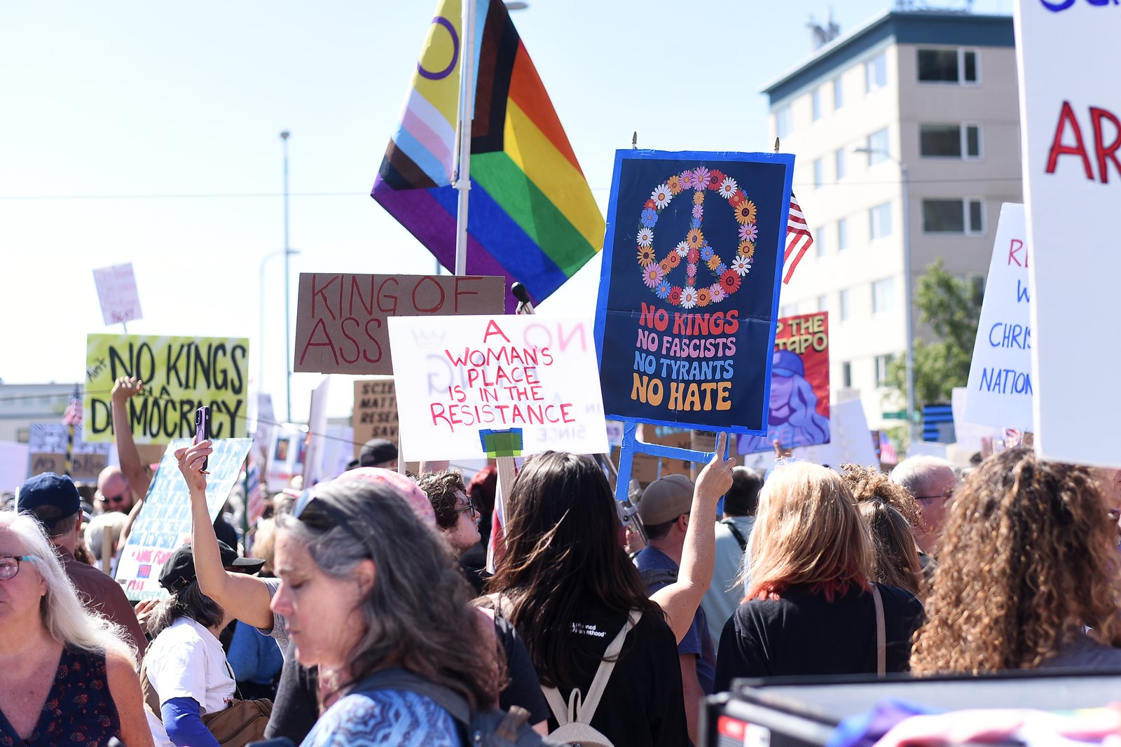 A diverse crowd of people gathered for a protest in Anchorage, Alaska, holding various signs with messages like 'NO KINGS NO FASCISTS NO TYRANTS NO HATE' and 'A WOMAN'S PLACE IS IN THE RESISTANCE', under a clear summer sky.