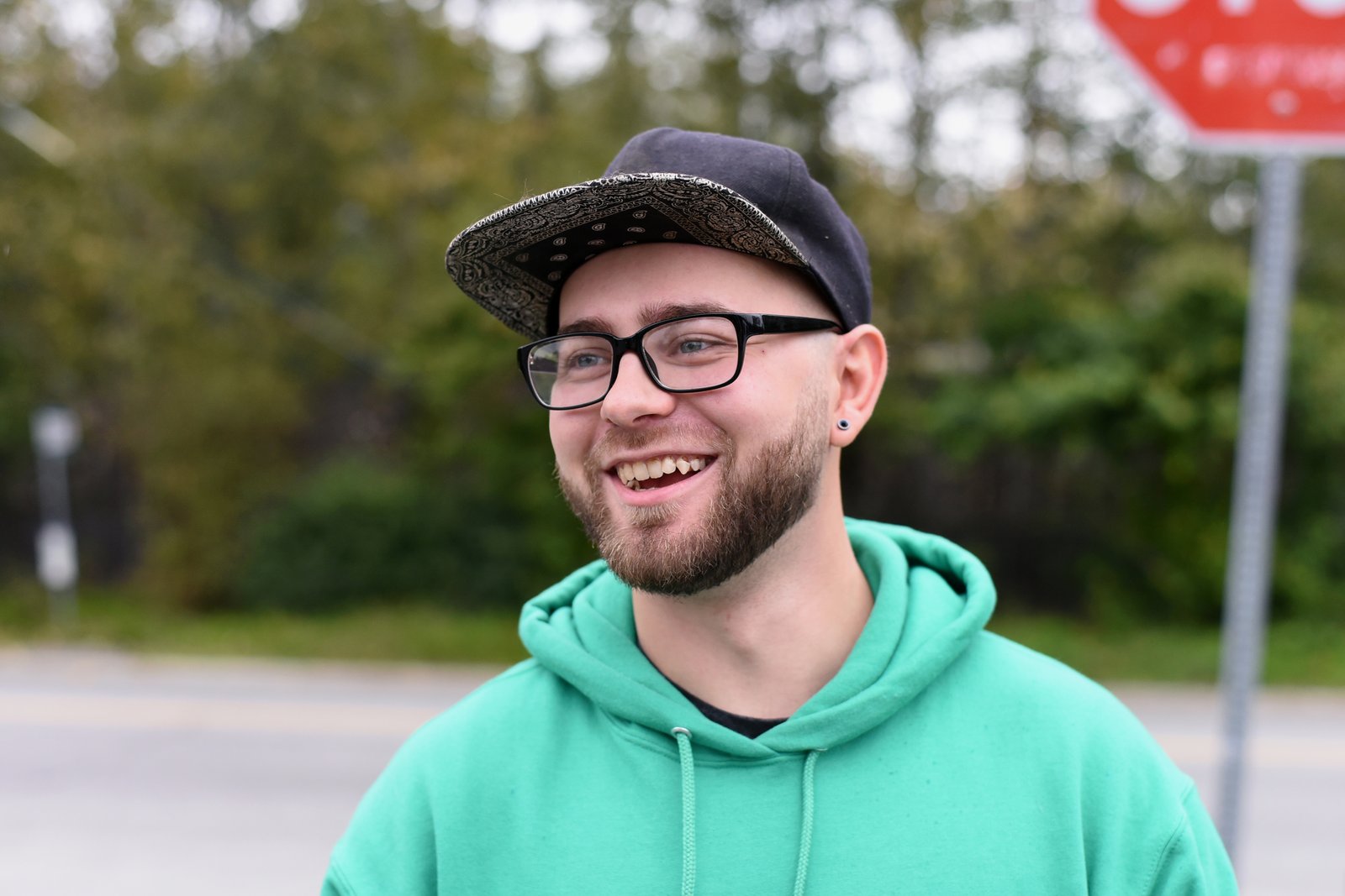A young man with a beard, glasses, and a baseball cap smiles broadly while wearing a green hoodie. He is outdoors with a blurred background of green trees, a road, and a red stop sign.