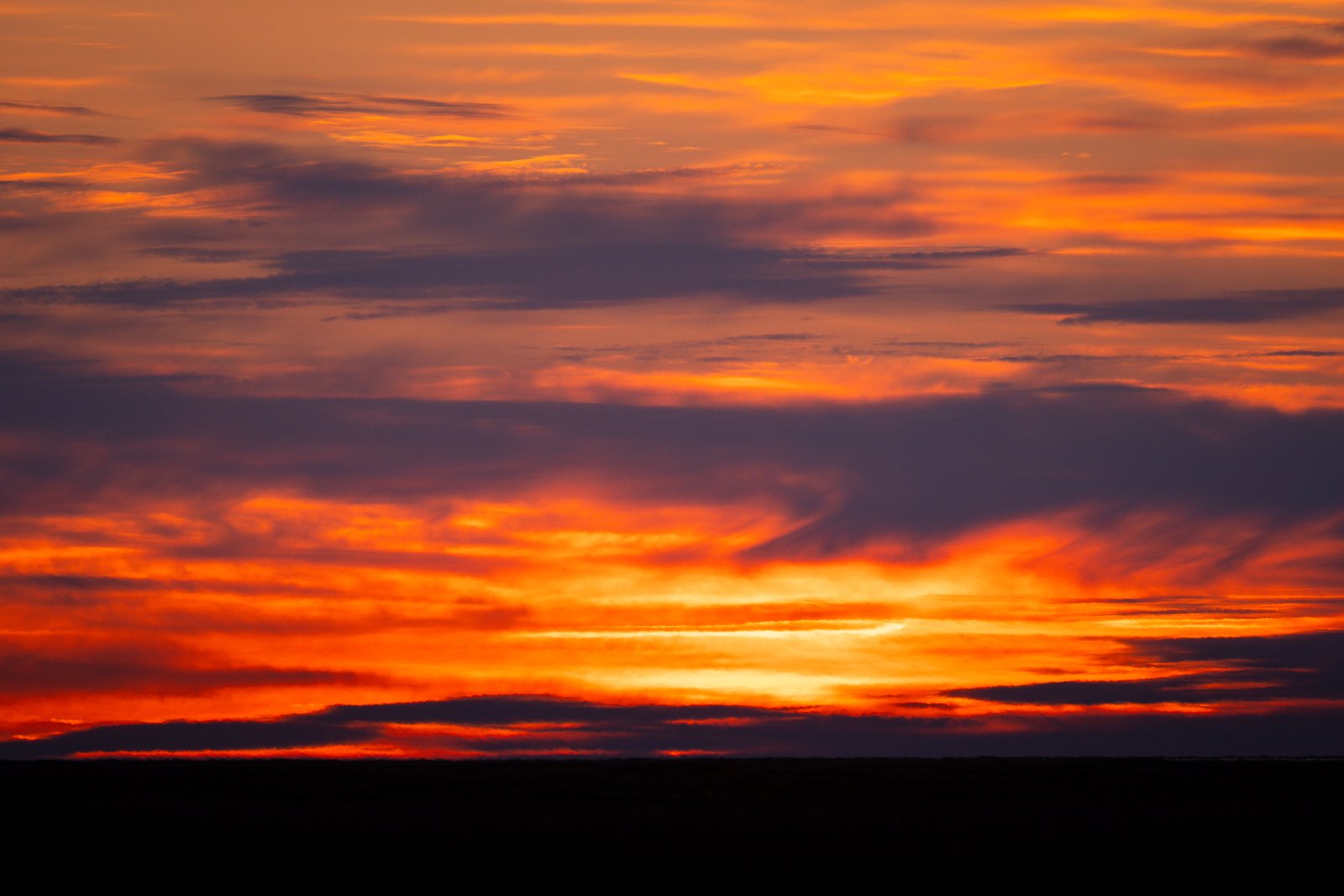 A dramatic sunset over a dark tundra horizon, featuring layers of clouds illuminated in intense shades of orange, red, and purple.