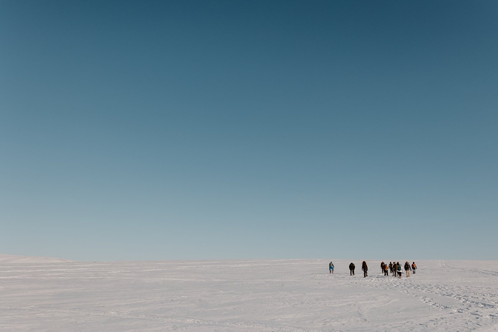 A group of people, seen from behind, walk across a vast, snow-covered plain under a clear blue sky, leaving a trail of footprints.