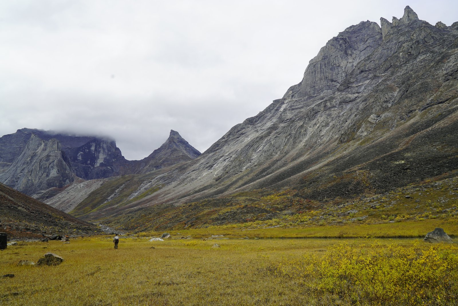 A lone ranger walks through a vast, golden-yellow valley surrounded by towering, rugged grey mountains under a cloudy sky in Alaska's remote Arrigetch Valley.