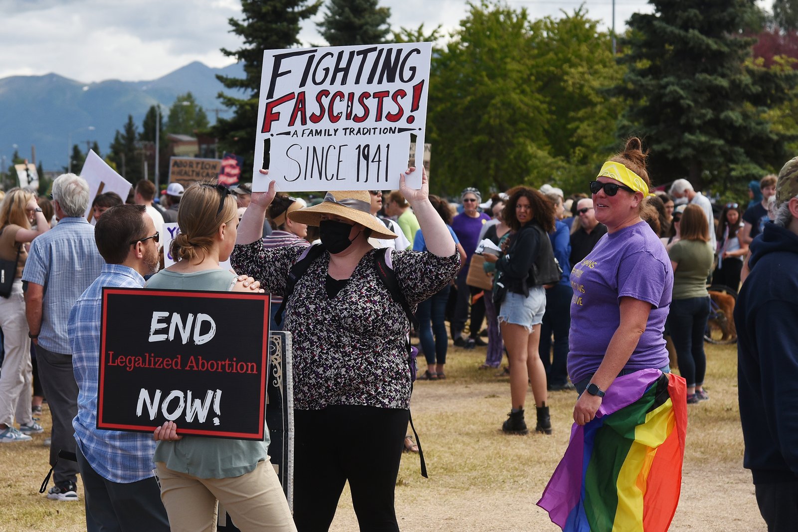 A diverse crowd gathers for a rally in downtown Anchorage, Alaska, with the Chugach Mountains in the background. Participants hold signs reflecting various viewpoints, including 'FIGHTING FASCISTS!' and 'END Legalized Abortion NOW!', on a summer day.