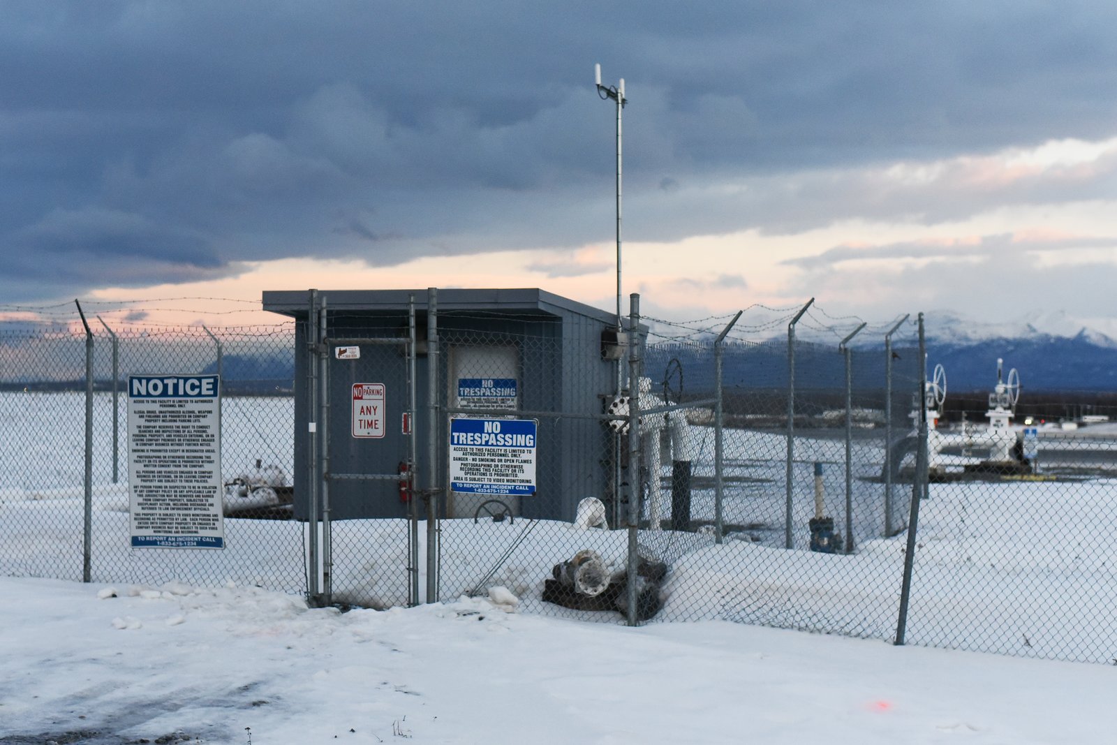 A snow-covered industrial facility, identified as Marathon Petroleum Corp at Anchorage Airport, is seen behind a chain-link fence with barbed wire. Distant snow-capped mountains are visible under a cloudy, twilight sky.