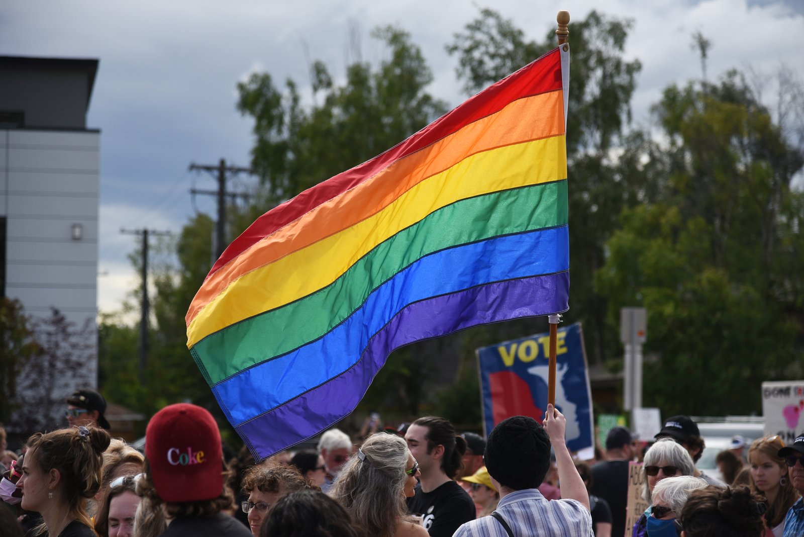 A large rainbow flag waves prominently above a diverse crowd of people gathered at a Planned Parenthood rally in downtown Anchorage, Alaska, with a 'VOTE' sign visible in the background.