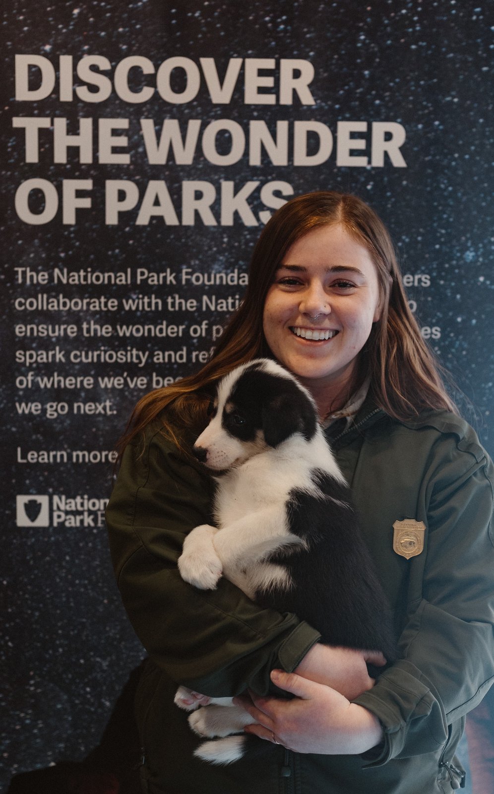 A smiling National Park Service ranger in uniform holds a black and white puppy, standing in front of a dark banner promoting national parks.