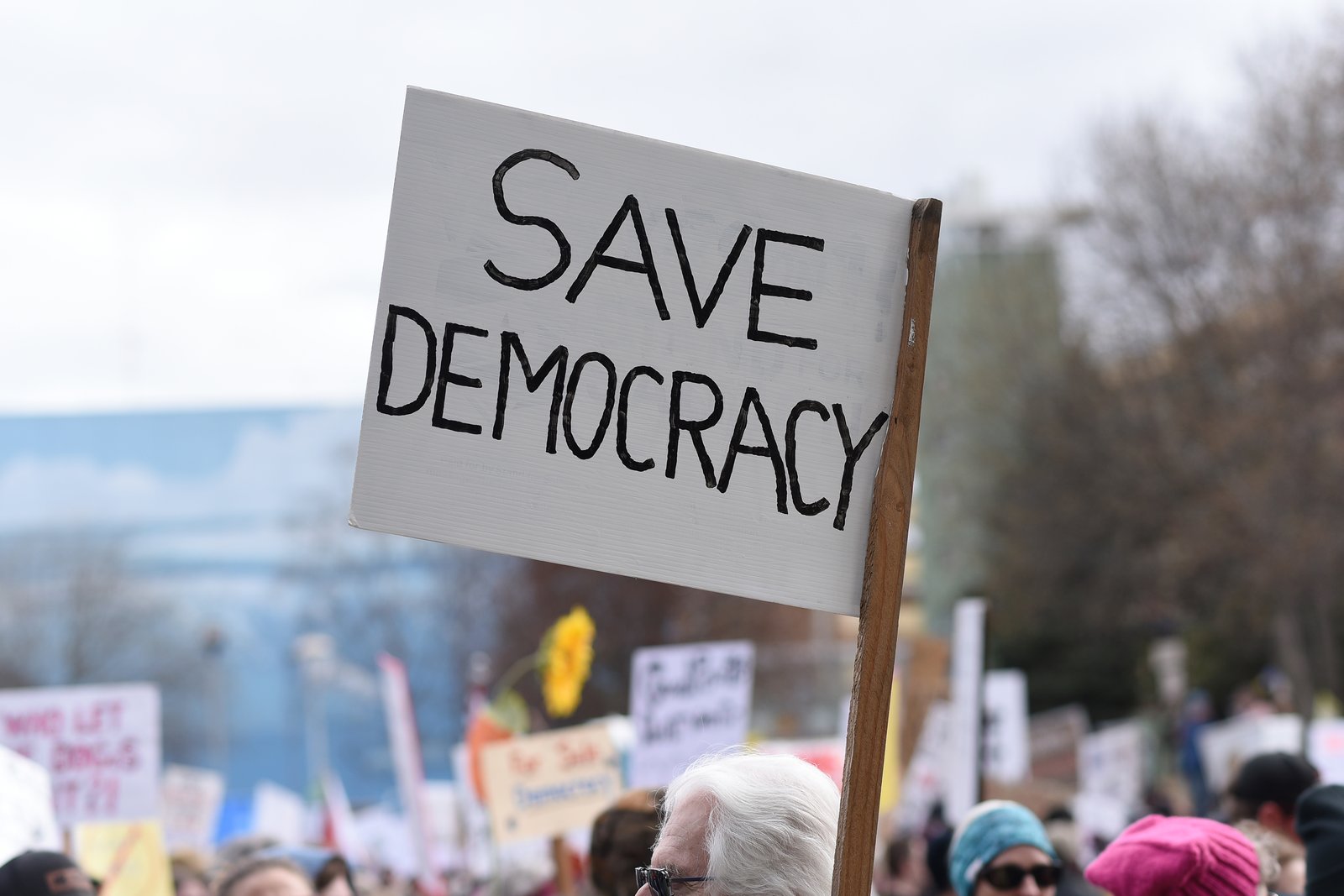 A close-up shot of a protest sign held by an individual in a crowd, reading 'SAVE DEMOCRACY' in black capital letters on a white background. The blurred background shows other protesters and signs at a community event in Anchorage.