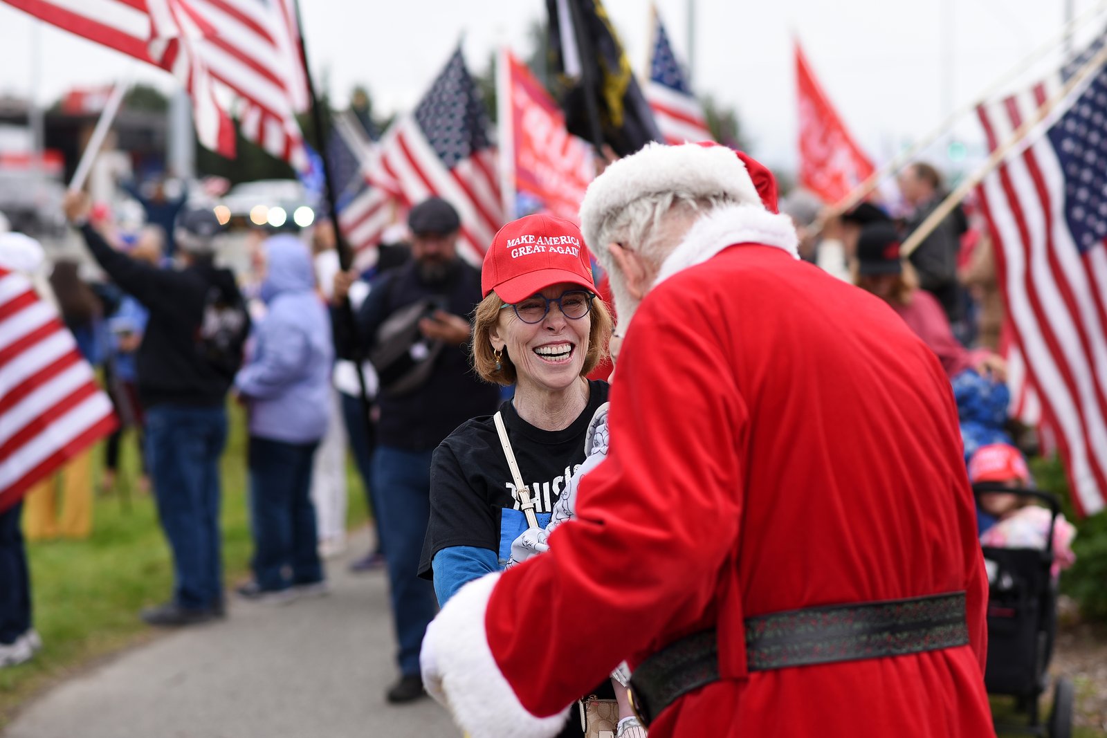 A woman wearing a 'Make America Great Again' hat smiles at a person dressed as Santa Claus at an outdoor pro-Trump rally in Midtown Anchorage. Numerous American flags and 'Trump' flags are visible in the background, held by other attendees.
