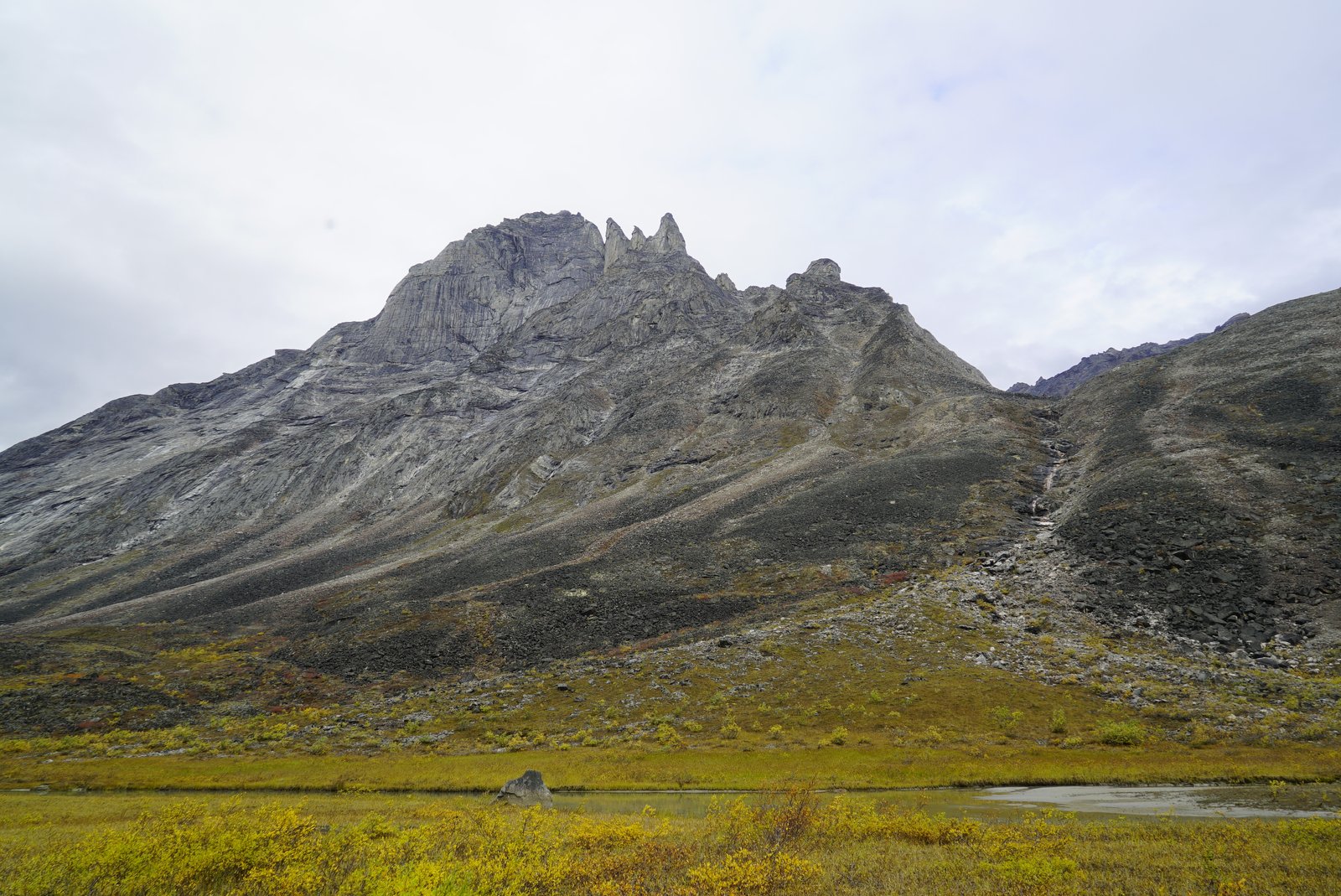 A wide shot of the majestic Arrigetch Peaks in Alaska's Brooks Range, showcasing their steep, rocky faces under an overcast sky. The valley floor in the foreground is covered in vibrant yellow and green autumn tundra vegetation, with a small stream or pond reflecting the sky.