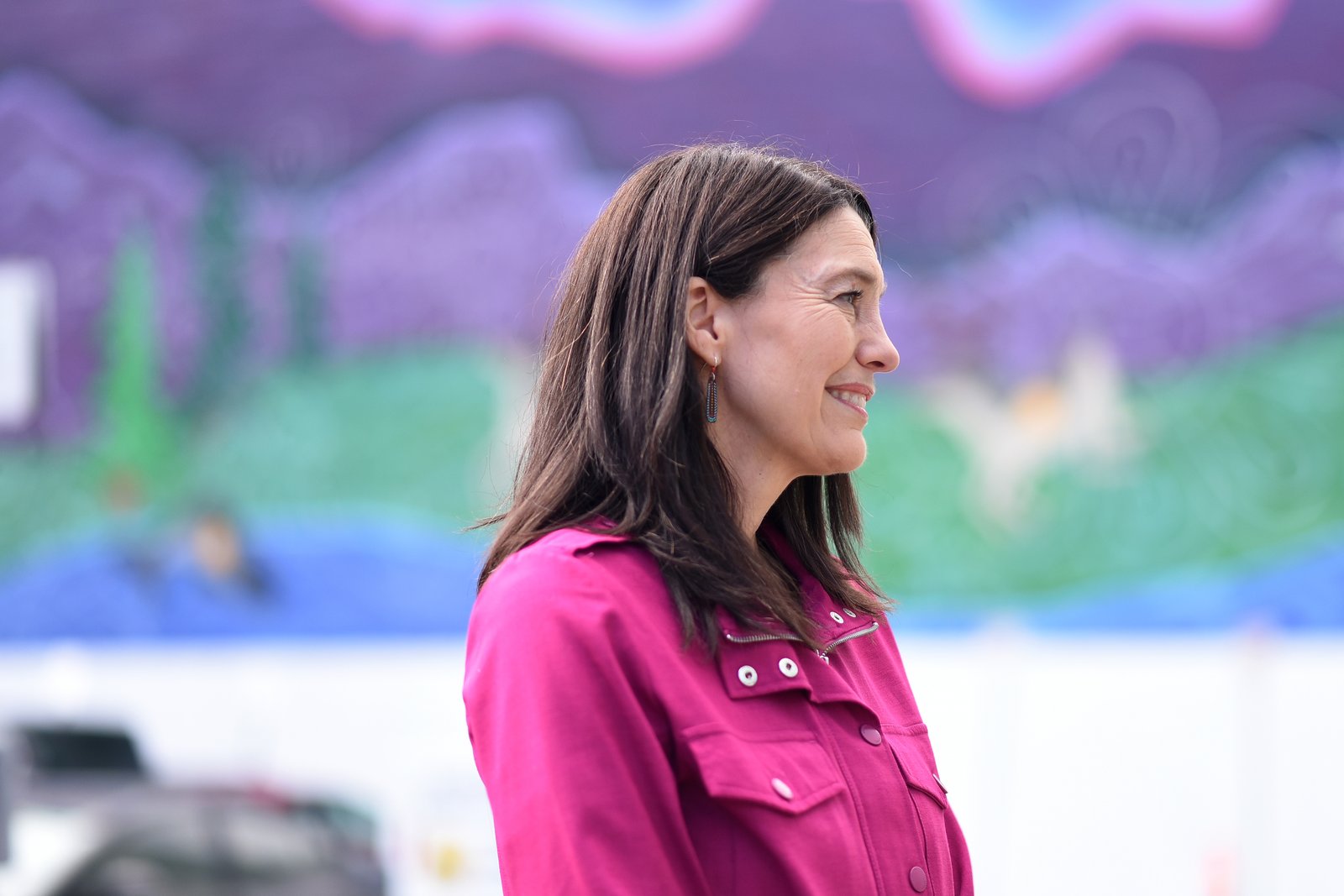 Suzanne LaFrance, a woman with long dark hair and a bright pink jacket, smiles and looks to her left, with a vibrant, blurred mural serving as the background.